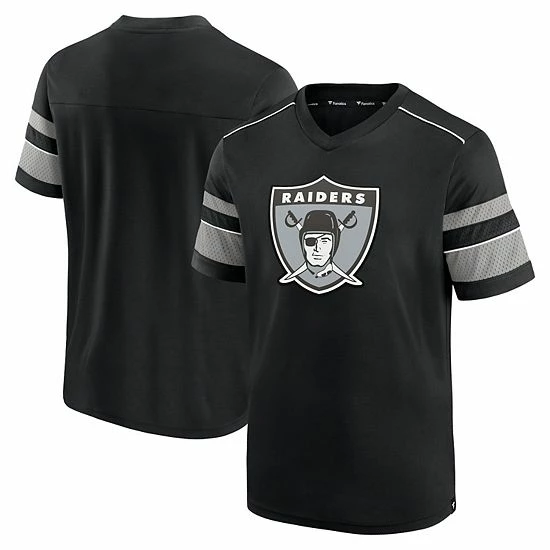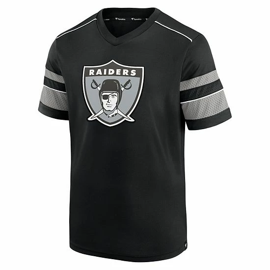 Take your Las Vegas Raiders apparel back to a bygone era with this Textured Throwback Hashmark T-shirt from Fanatics Branded. It features a large Las Vegas Raiders logo highlighted by the coordinating sleeve stripes. The mesh detailing also adds a jersey-like look to this V-neck tee.