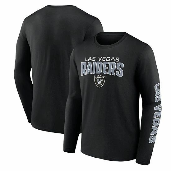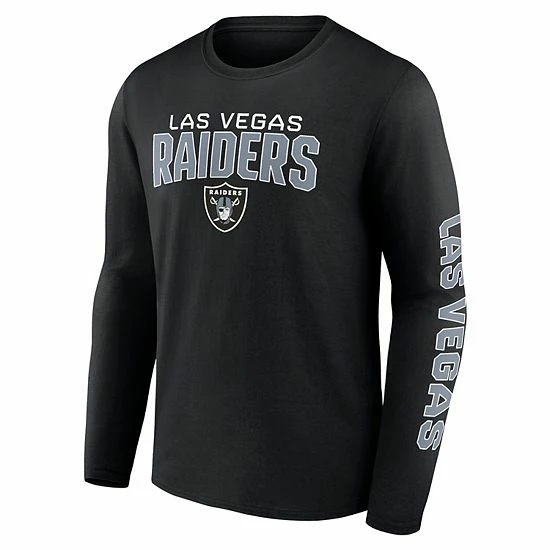 Go the Distance and showcase your Las Vegas Raiders pride by grabbing this Fanatics Branded T-shirt. It features bold Las Vegas Raiders wordmark graphics on the chest and down the sleeve that can easily be paired with other chilly-weather fan gear. A classic tee construction and soft fabric pair for the ultimate casual feel.