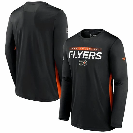 As the Philadelphia Flyers hit the rink, show off your unwavering pride with this Fanatics Branded Pro Performance T-shirt. The toasty long sleeves and soft fabric bring added warmth and comfort to your day. Plus, the striking Philadelphia Flyers graphics on the chest add authentic team flair to your collection of cool weather gear.