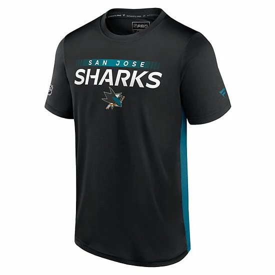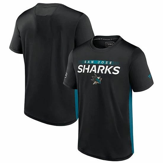 Get ready for puck drop in style with this San Jose Sharks Authentic Pro Rink Tech T-shirt from Fanatics Branded. The bold graphics feature a prominent wordmark with a team logo underneath. The contrasting colors on the sides make this a great casual option on game day.