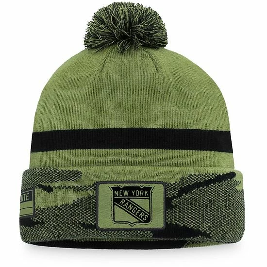 Chilly New York Rangers game days are no match against your team loyalty when you wear this Military Appreciation cuffed knit hat with pom from Fanatics Branded. It features distinctive team graphics and a stylish, knit camo pattern on the cuff. Designed to stretch for a comfortable fit, this hat is perfect for loyal New York Rangers fans.