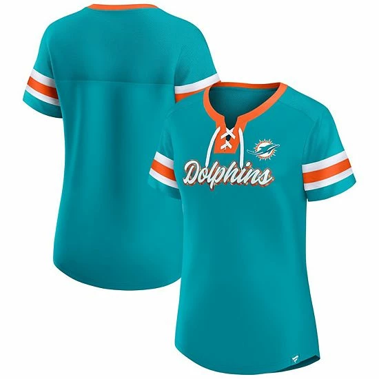 Elevate your style on game day by sporting this Miami Dolphins Original State T-shirt from Fanatics Branded. It features a chic lace-up neckline and sleeve stripes that coordinate with the team’s name across the front. Mesh fabric also gives this Miami Dolphins tee a breathable feel for more comfortable wearing during warmer weather.