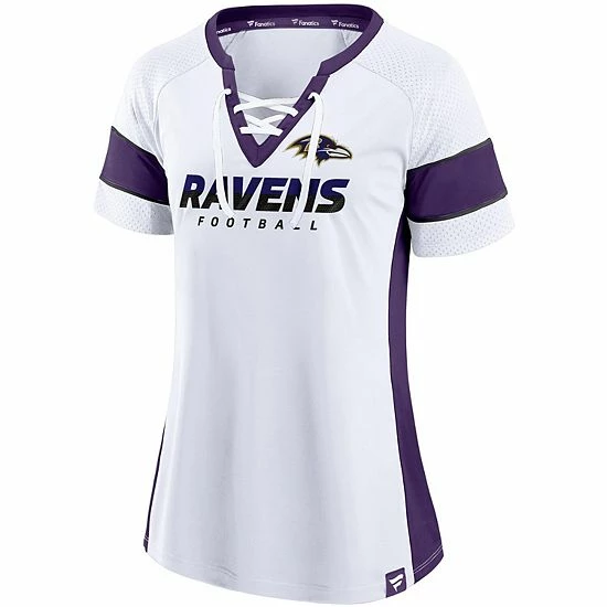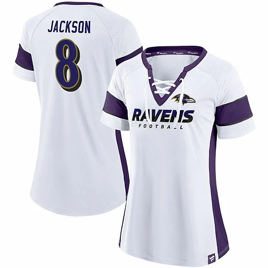Cheer on the Baltimore Ravens in style with this fashionable Lamar Jackson Athena Player V-neck raglan T-shirt. This Fanatics Branded top features a stylish lace-up neck and Lamar Jackson graphics on the back. Add a fun finish to any Baltimore Ravens look with this eye-catching tee.
